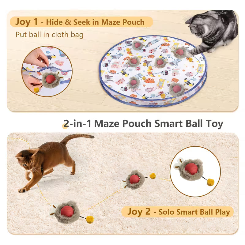 🌀 Tryb 1: Mata labiryntowa – Hide & Seek Ukryj piłkę w materiale maty i obserwuj, jak kot tropi, łapie i „poluje”.